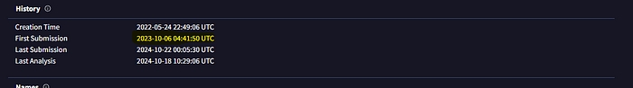 3. Knowing the exact time the malware was first seen can help prioritize actions. If the malware is newly detected, it may warrant more urgent containment and eradication efforts compared to older, well-known threats. Can you provide the UTC timestamp of first submission of this malware on VirusTotal?